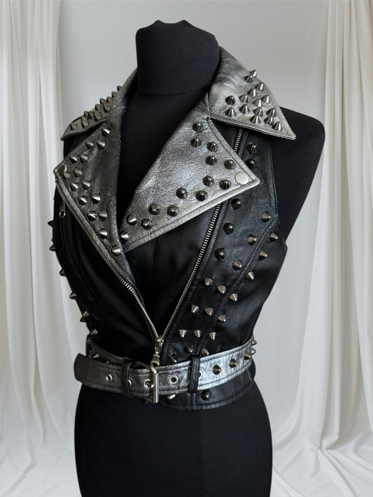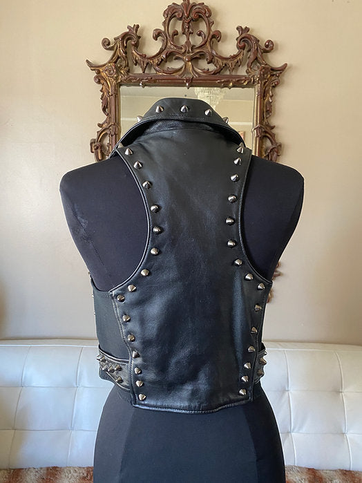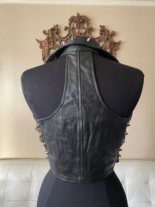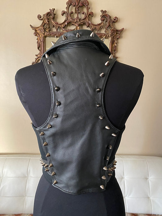 Black Spiked Studded Womens Leather Punk Vest, M