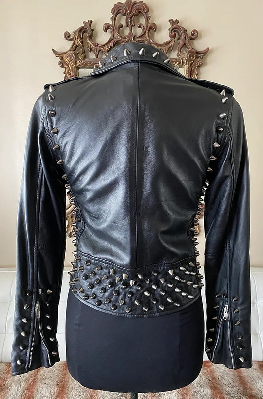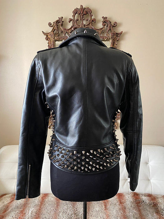 Black Spiked Black Womens Leather Moto Jacket, Upcycled, Size 4-6P