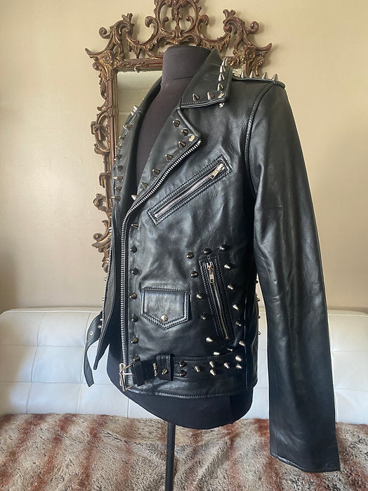 High Quality Mens Lambskin Leather Motorcycle Jacket w Silver Studs, L