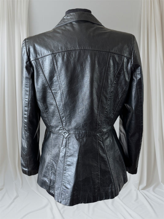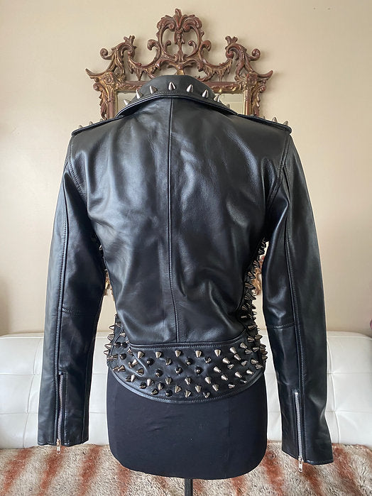 Black Spiked Black Womens Leather Moto Jacket, Upcycled, Size 4-6P