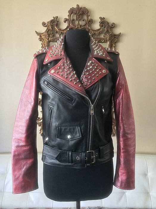 Red Metallic Studded Cow Leather Motorcycle Jacket, New, XS