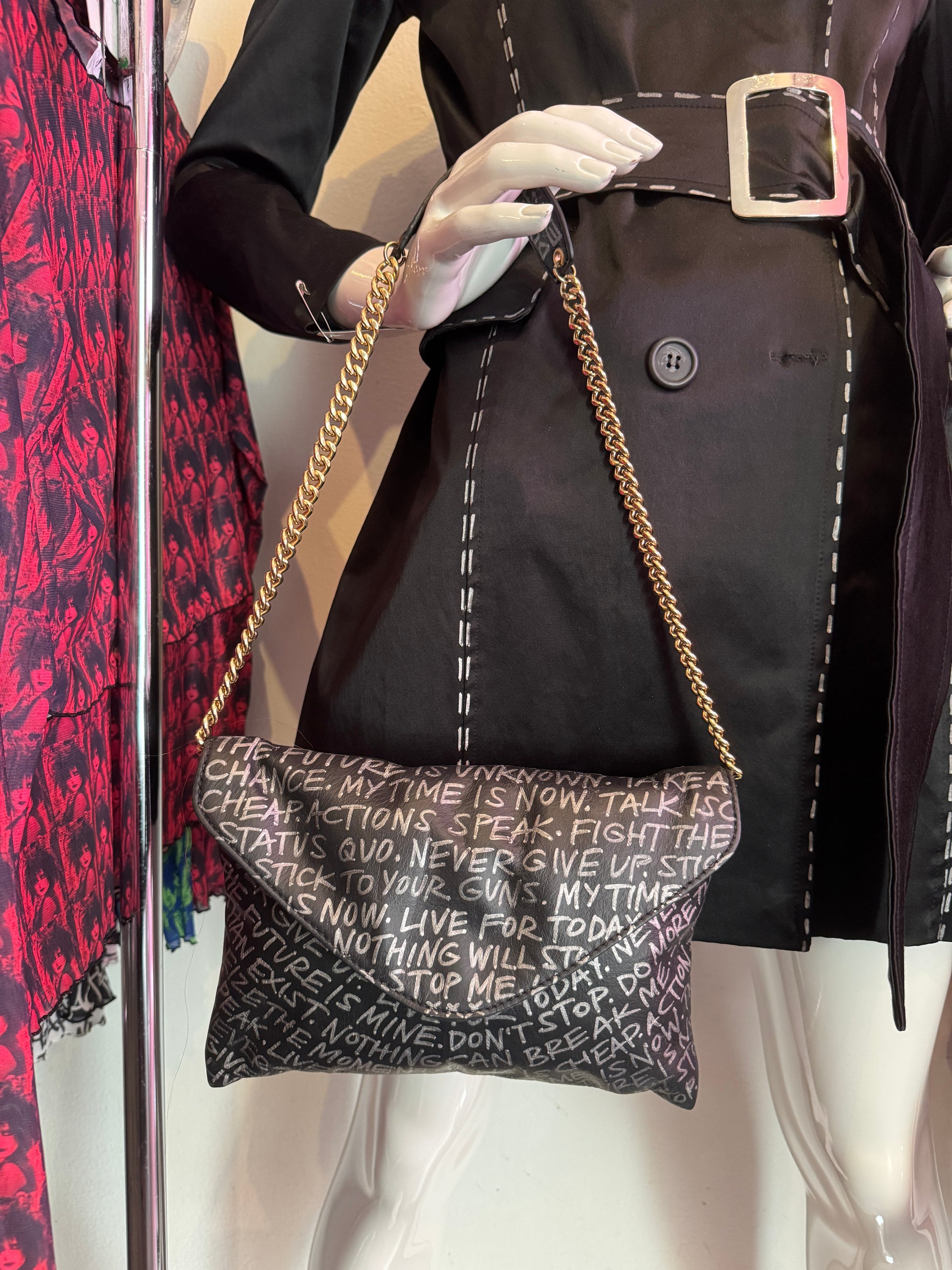 Black Empowering Statement Leather Chain Purse is one-of a kind, hand painted, upcycled. This bag will bring you constant compliments! One of one! This one features a gold chain.