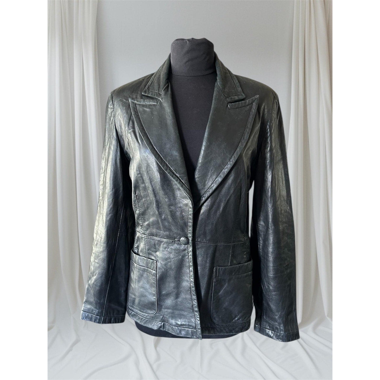 Black Leather Women's Blazer, Size Medium. Brand: Trilogy (Rampage clothing co), Vintage 90s, Genuine Leather. Cool lapel shape. See Measurements. This is a classically tailored great staple fashion piece for any wardrobe!