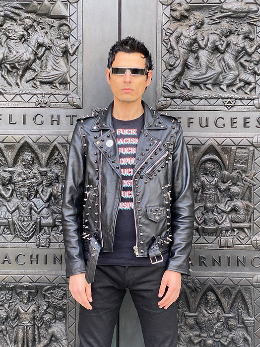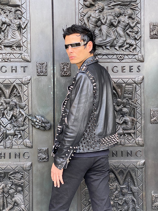 This one is sold, but I can recreate in any size. Beautiful High Quality Lambskin Leather with Black Cone Spikes. Men’s Studded Lambskin Jackets are available in Sizes XXS- 4XL. These are made when ordered, and will take some time. They can be customized in Black or Silver Studs, highly embellished or more subtly embellished. Lambskin Lightweight Leather Biker with Epaulettes & Belt is a high quality lightweight jacket, perfect to wear in climates that are not super cold.
