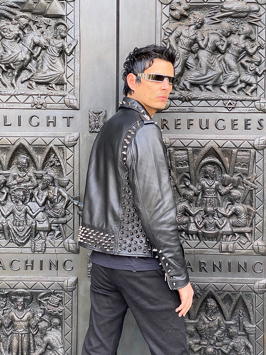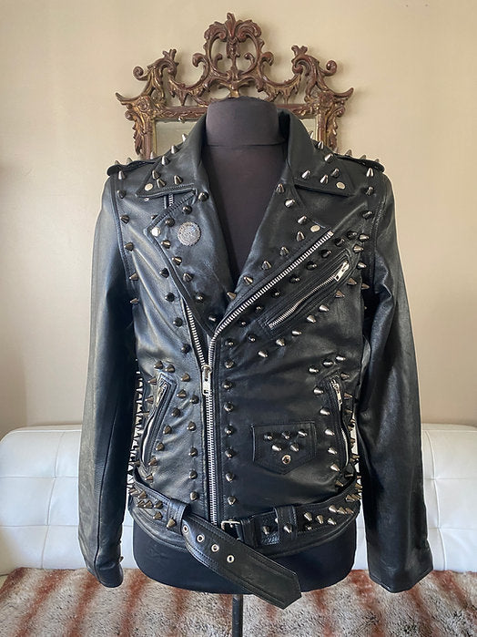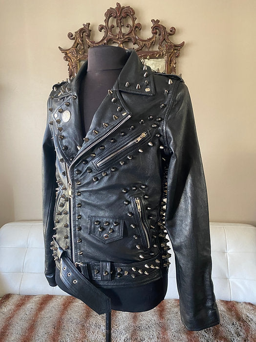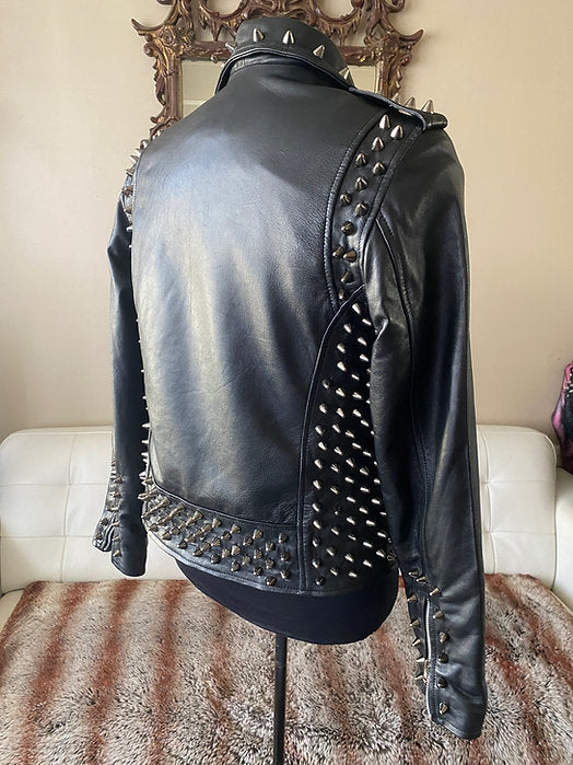 High Quality Lightweight Lambskin Leather Motorcycle Jacket, Hand Studded. These jackets are stunning, high quality leather, punk couture. I can customize them in all sizes. Runs slim, so order one size up from your normal size. Item pictured is a Large. See Size Chart.