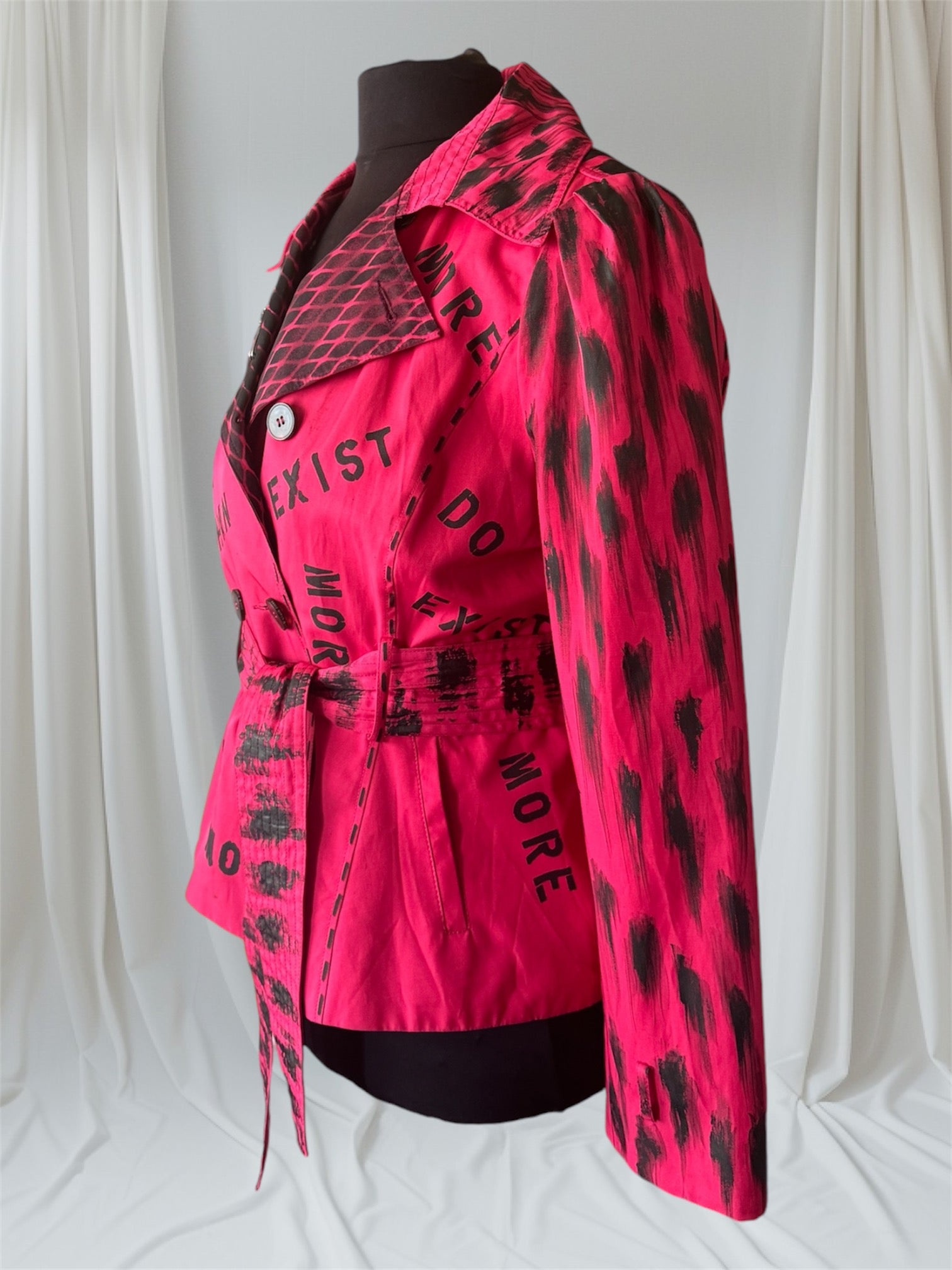 This gorgeous punk-inspired one-of-a-kind lightweight hot pink trench coat is a show-stopper. Upcycled, hand-painted, and embellished with a rhinestone safety pin. Size XL.