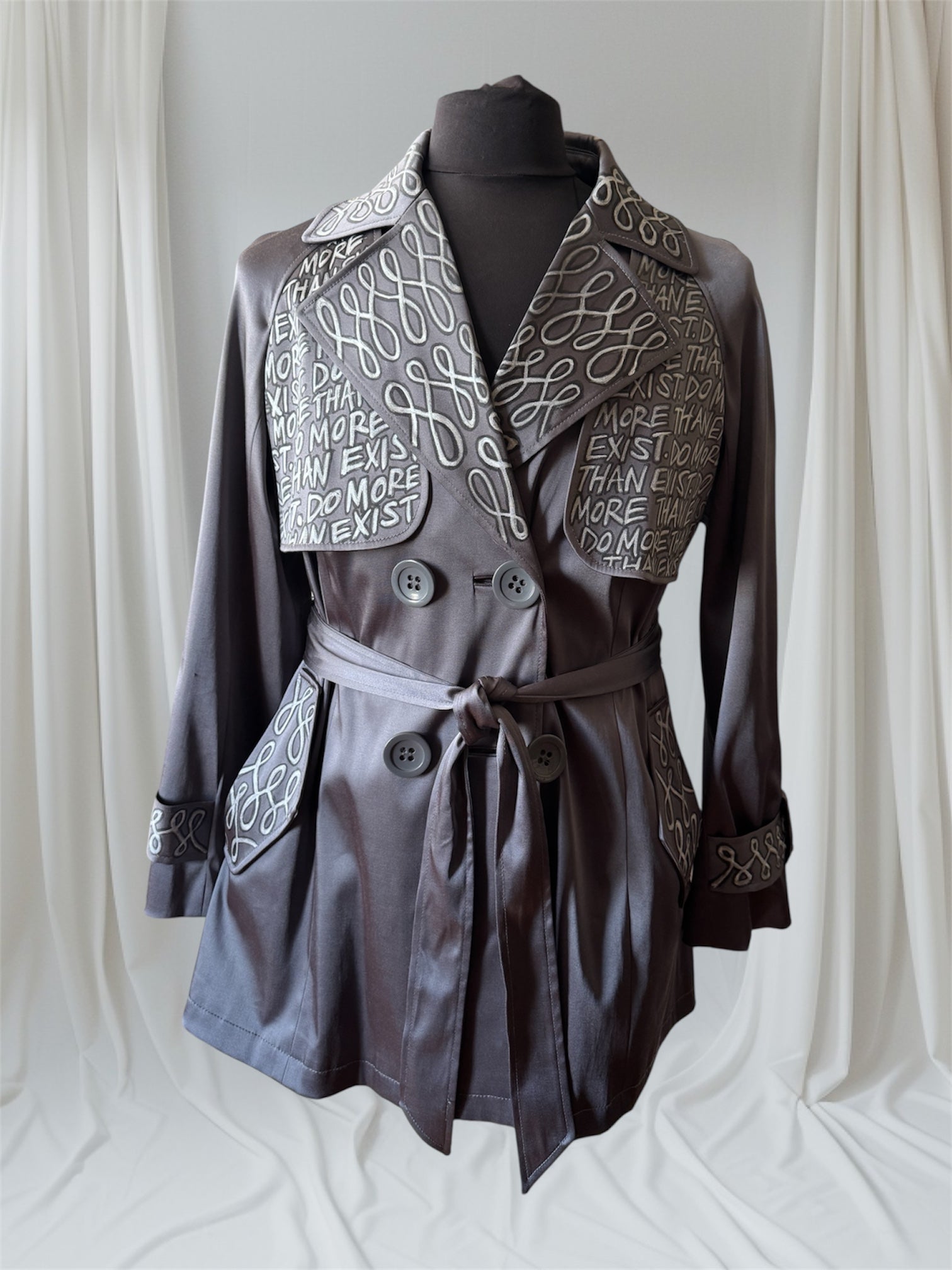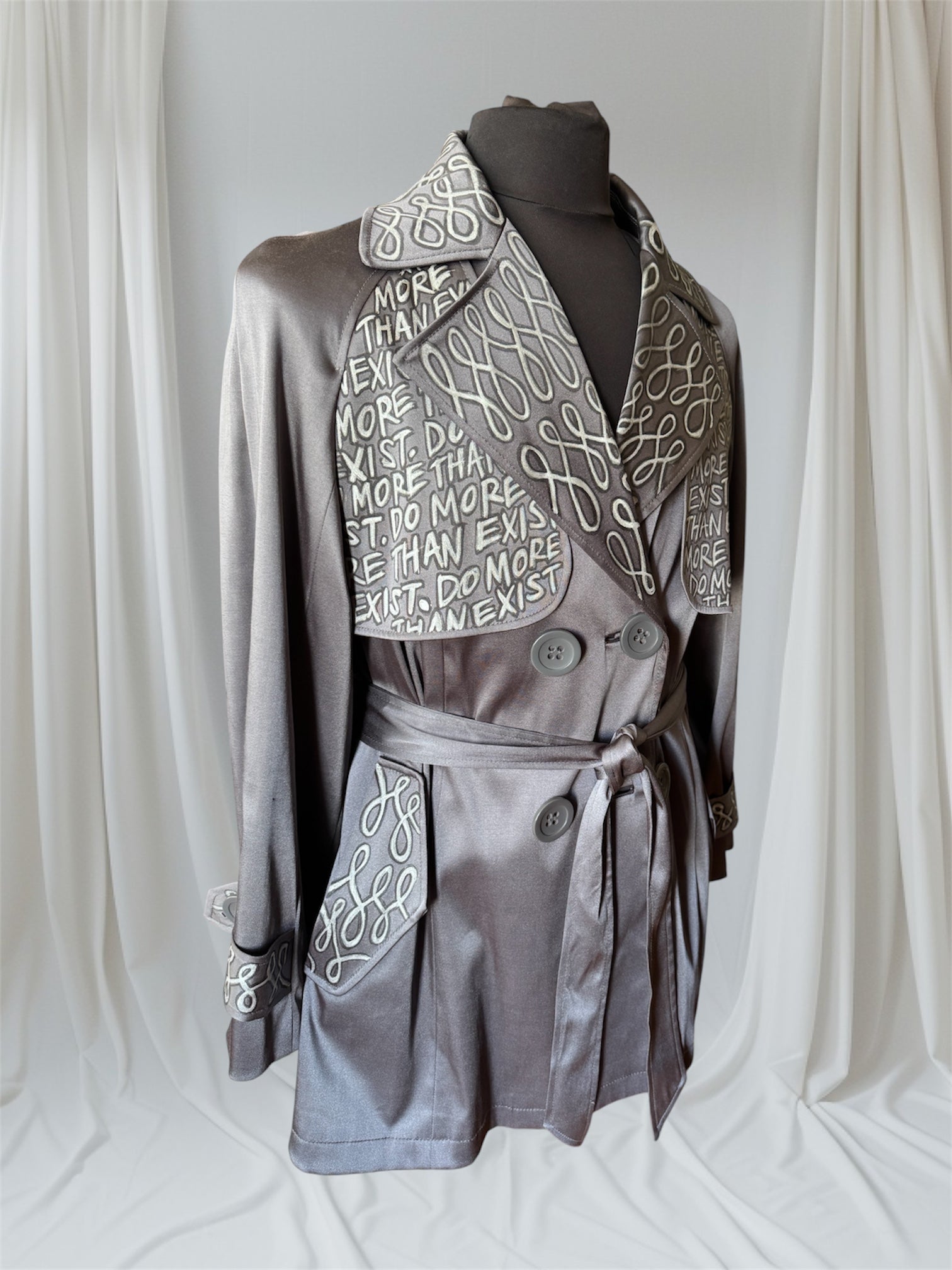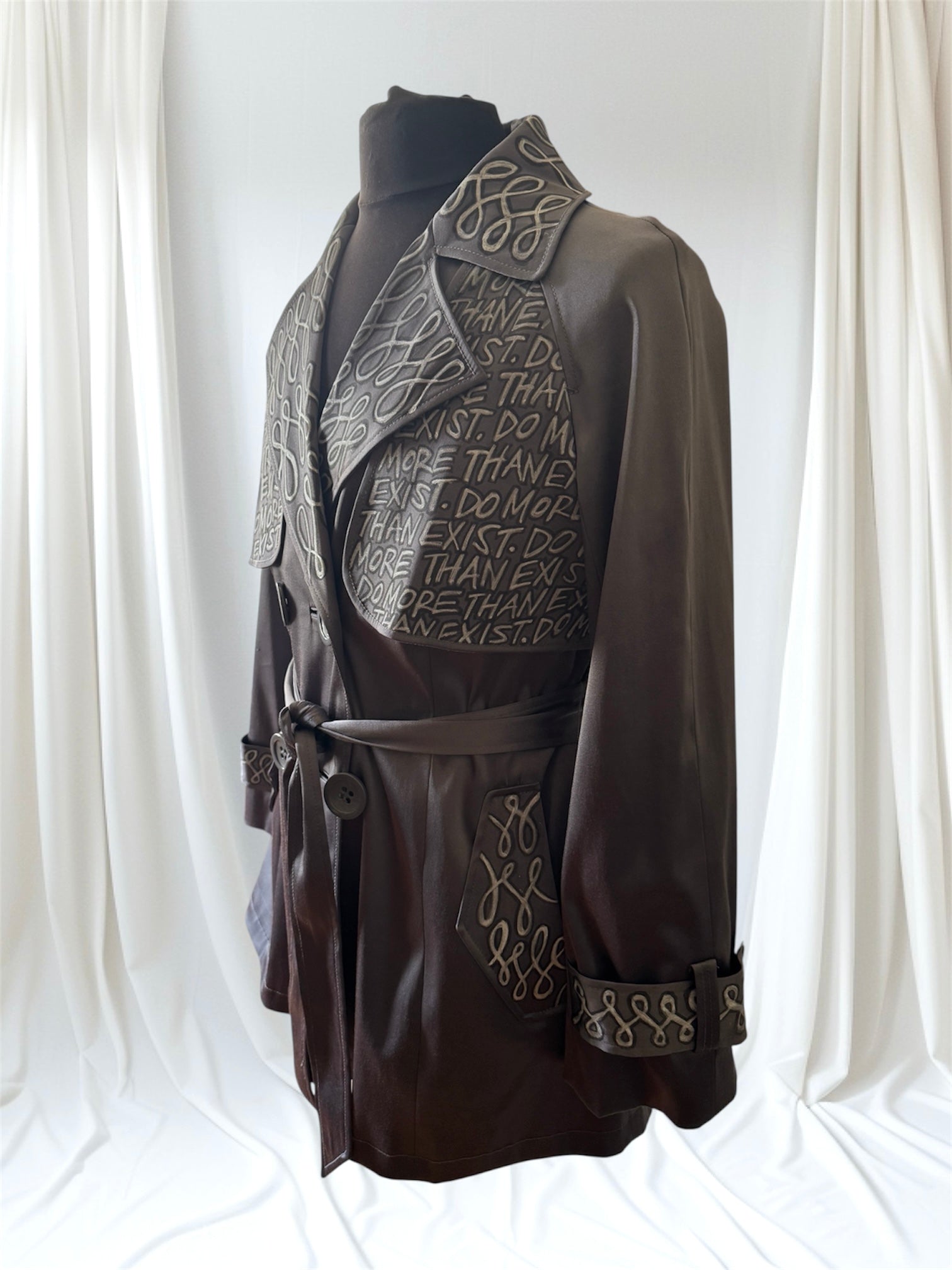 Custom one-of-a-kind “LIVE FOR TODAY” hand painted and embellished trench coat with spiked lapels. Dry clean safe.