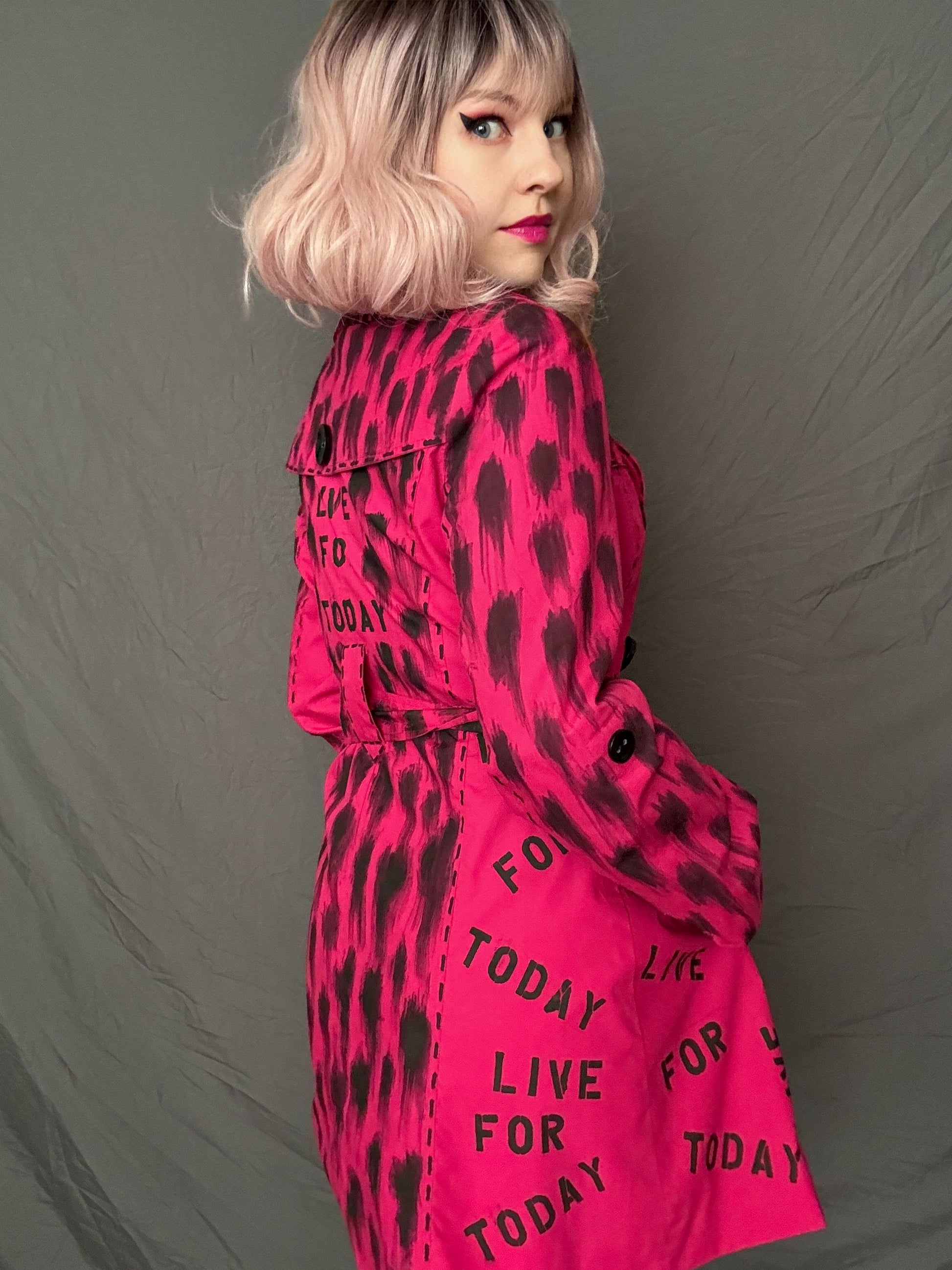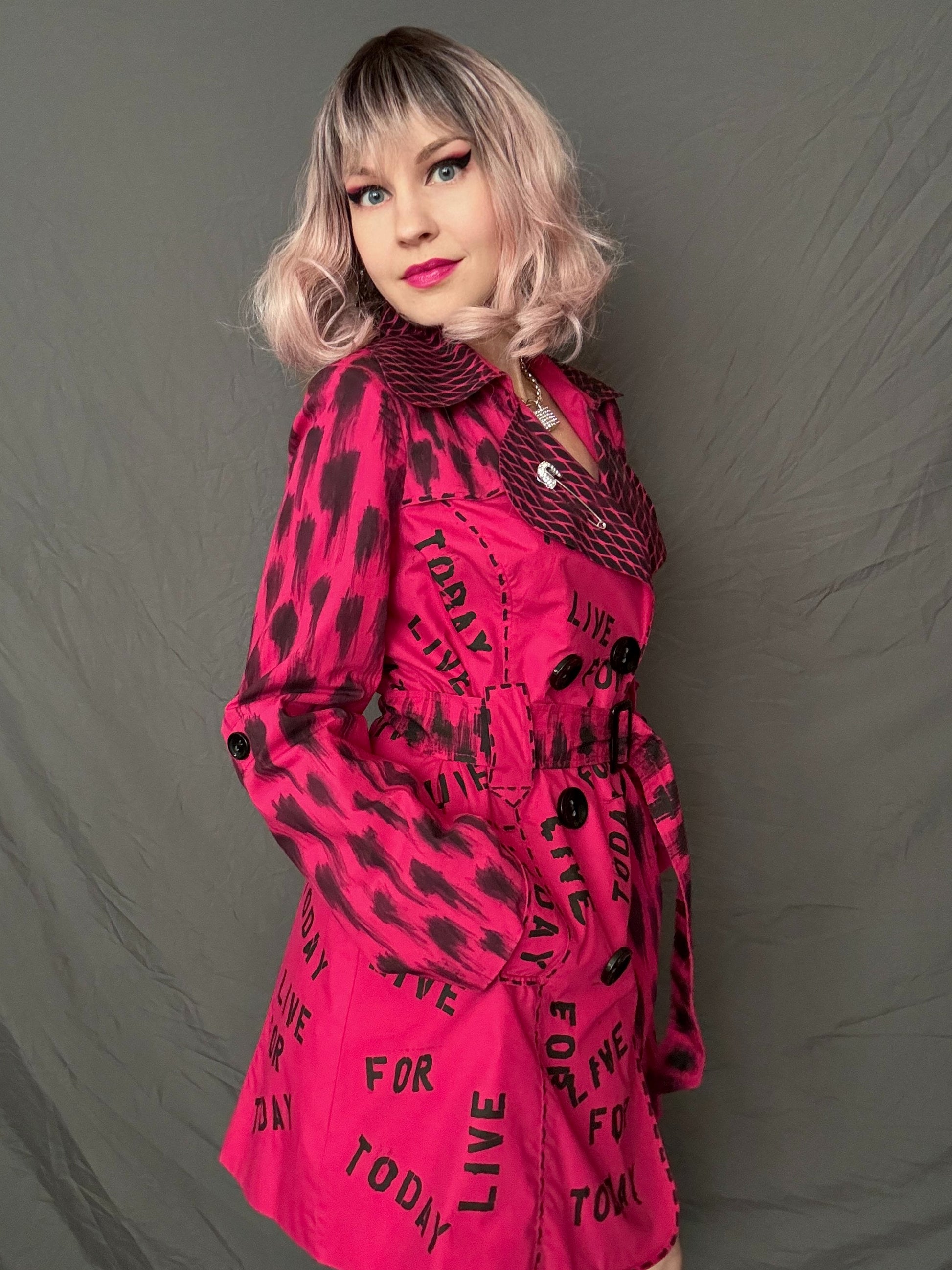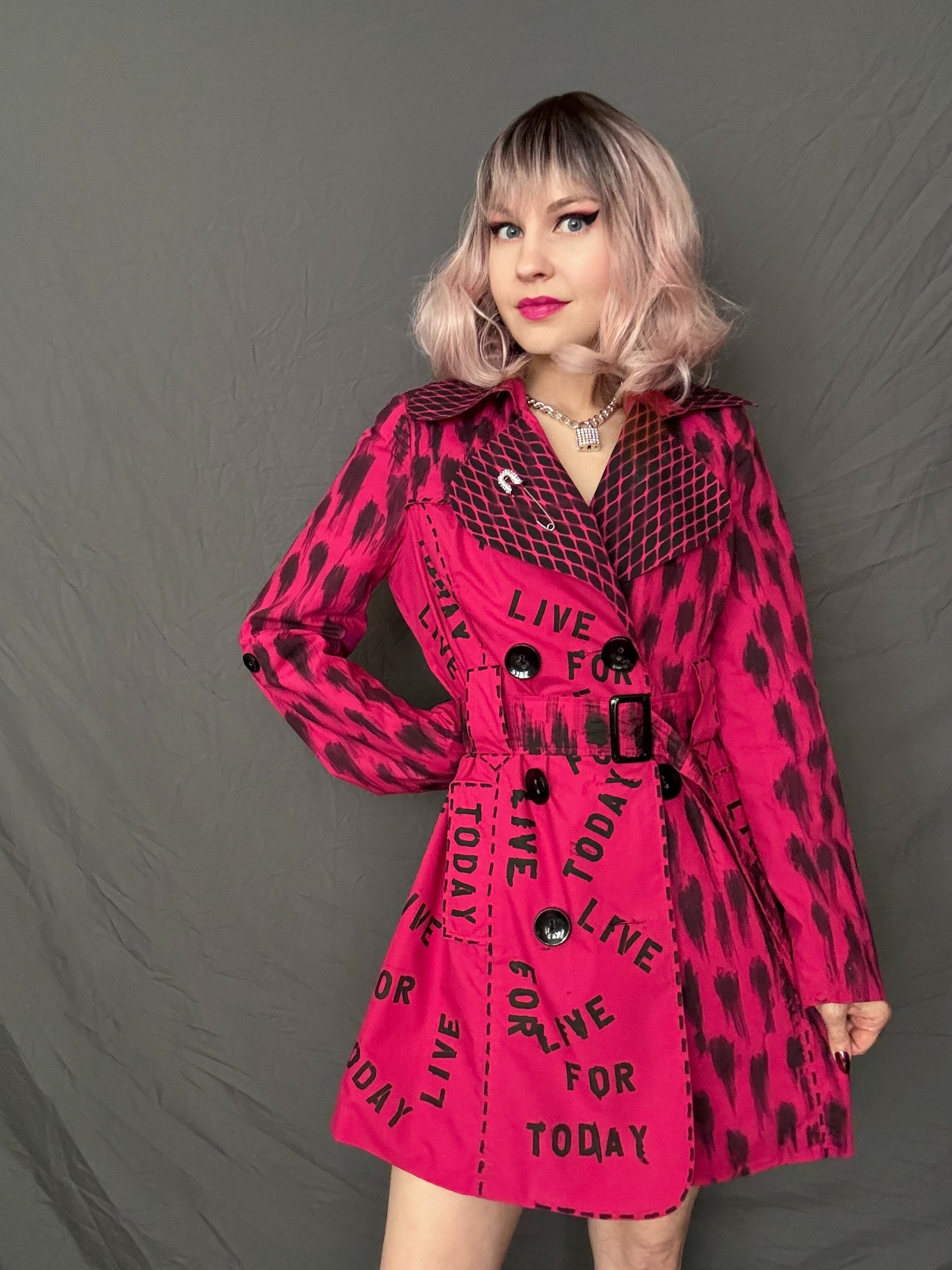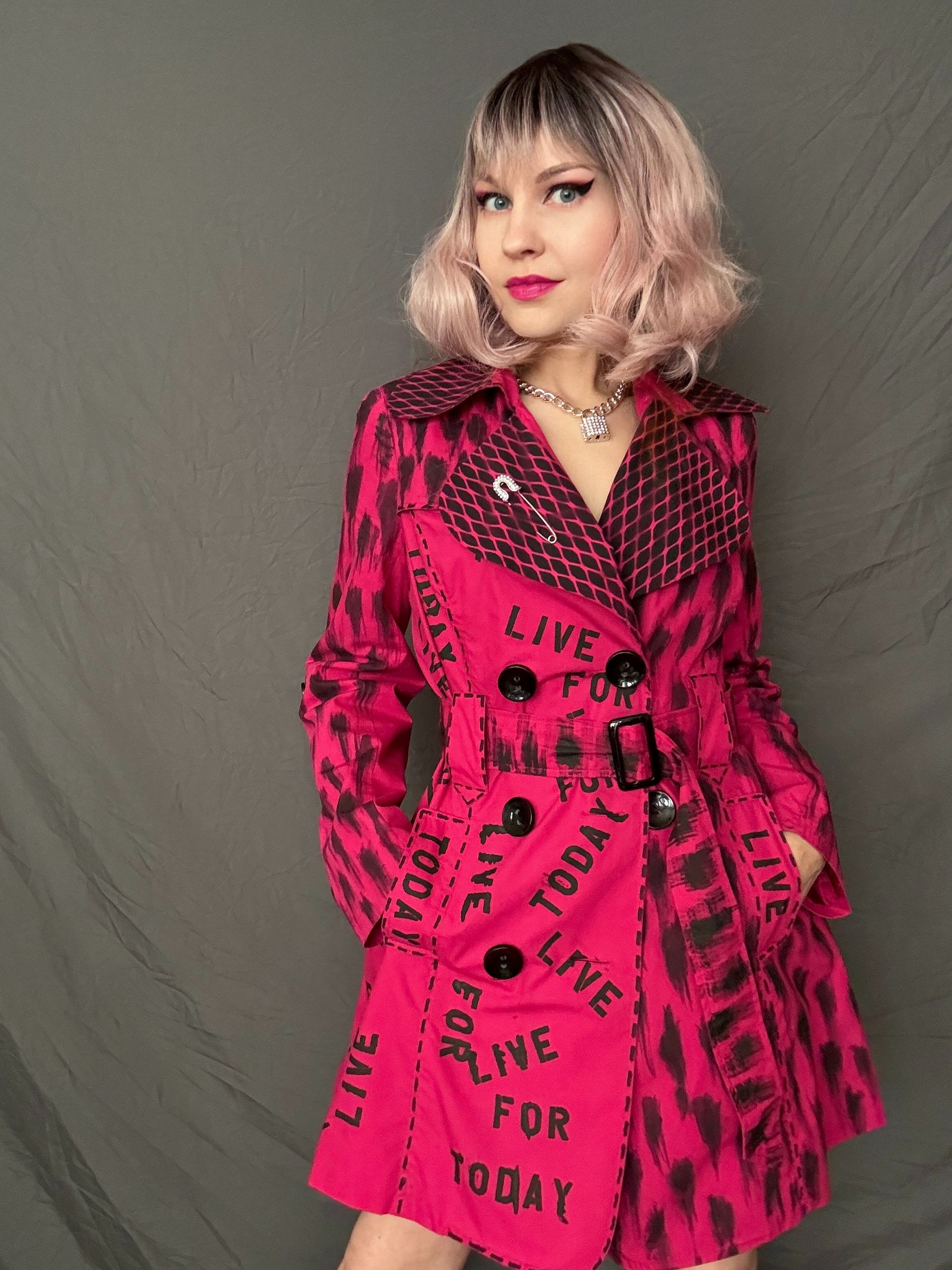 This gorgeous punk-inspired one-of-a-kind lightweight hot pink trench coat is a show-stopper. Upcycled, hand-painted, and embellished with a rhinestone safety pin. Size Medium, fits a 4-8. The model is size 4.