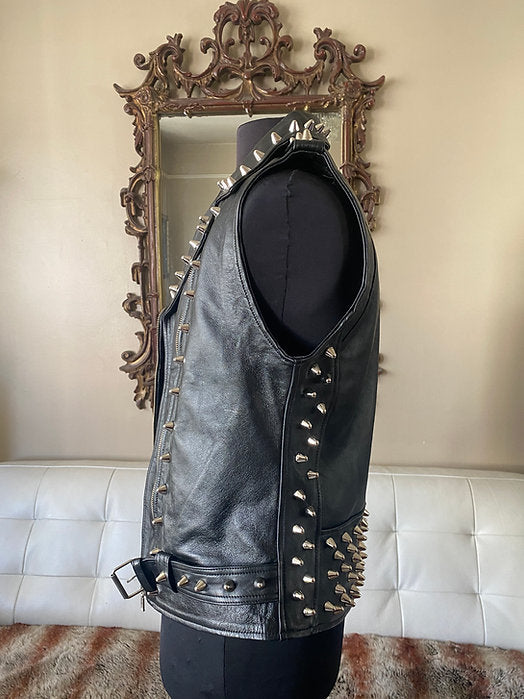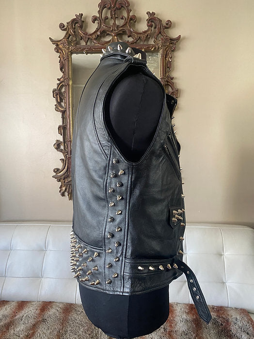 Beautiful High Quality Lambskin Leather Motorcycle Vest with Silver UK 77 Studs. This size Medium (Slim Fit) fits a 36" chest. Mannequin is 38. Can be replicated in any size. Only one Medium with Silver studs is available, ready to ship.