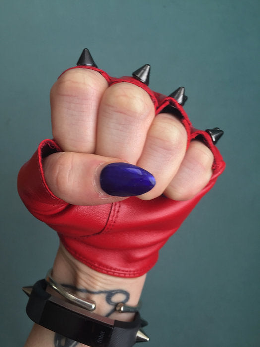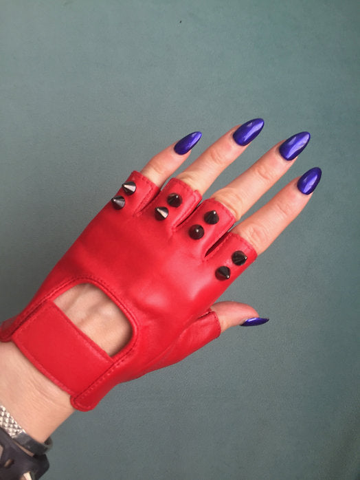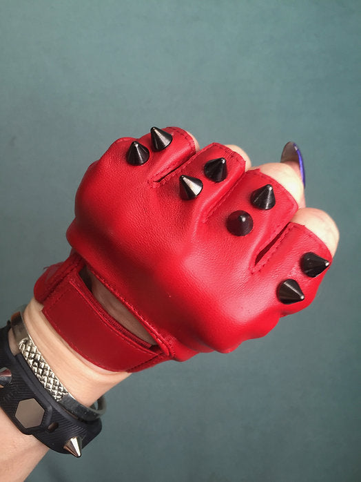 Red Italian Leather fingerless gloves with 2 black Spikes per finger. Leather will stretch. Sizes S-L. Large can fit many men.