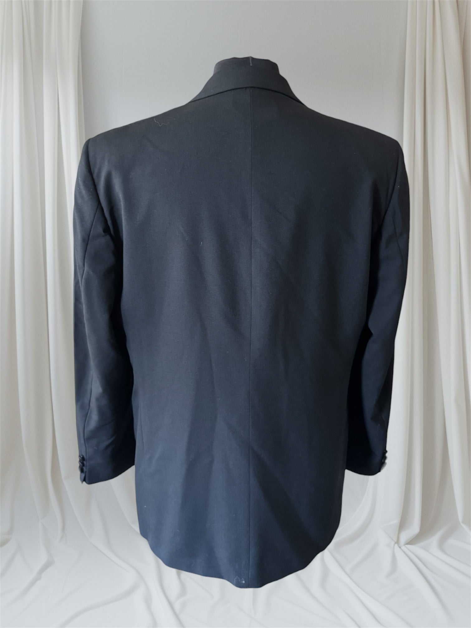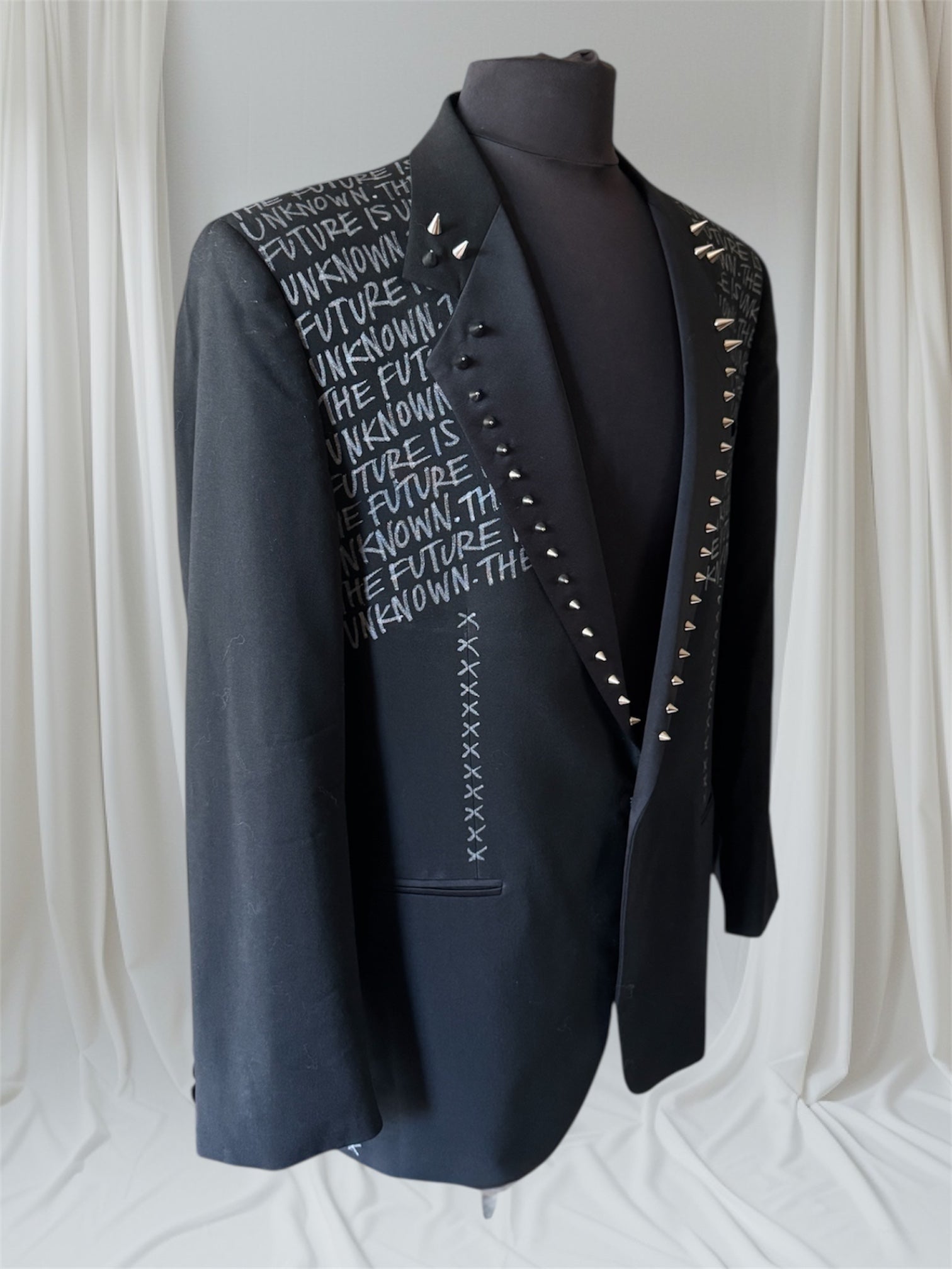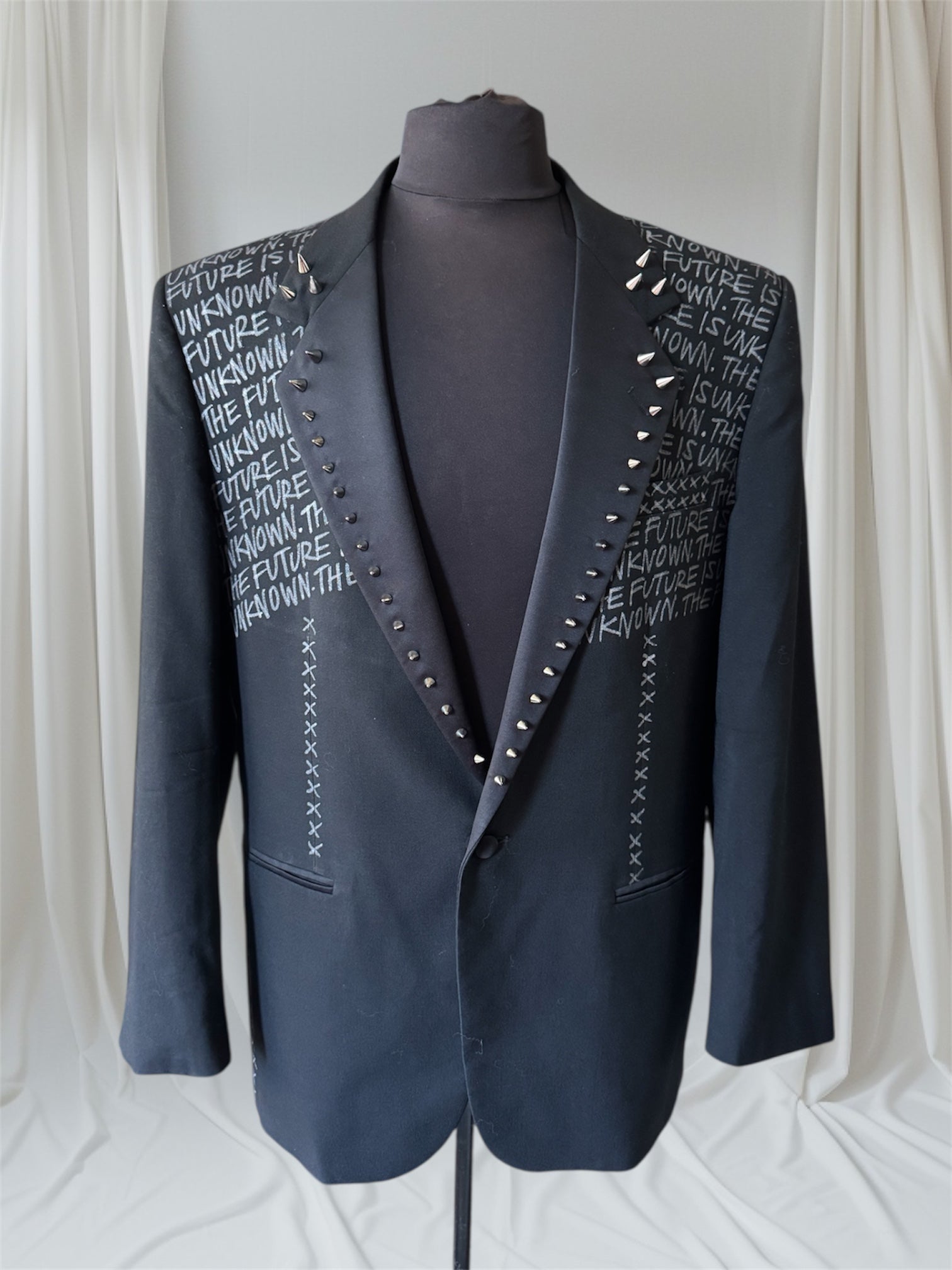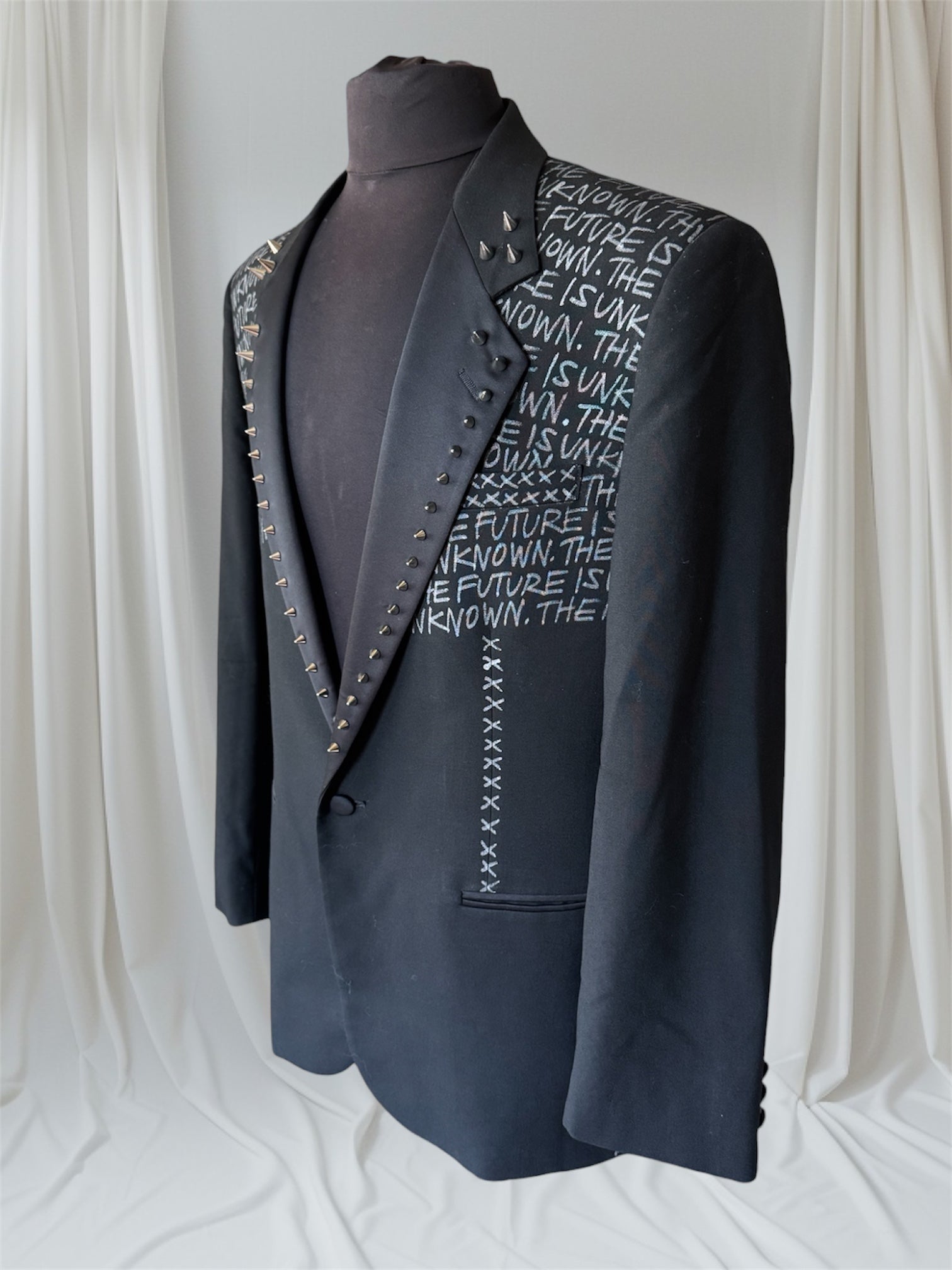 THE FUTURE IS UNKNOWN eco-conscious Upcycled Men's Suit Jacket. Stand out with a one-of-a-kind statement piece, hand-painted and embellished spiked collar, dry clean safe. This fits a Large, 42" chest.