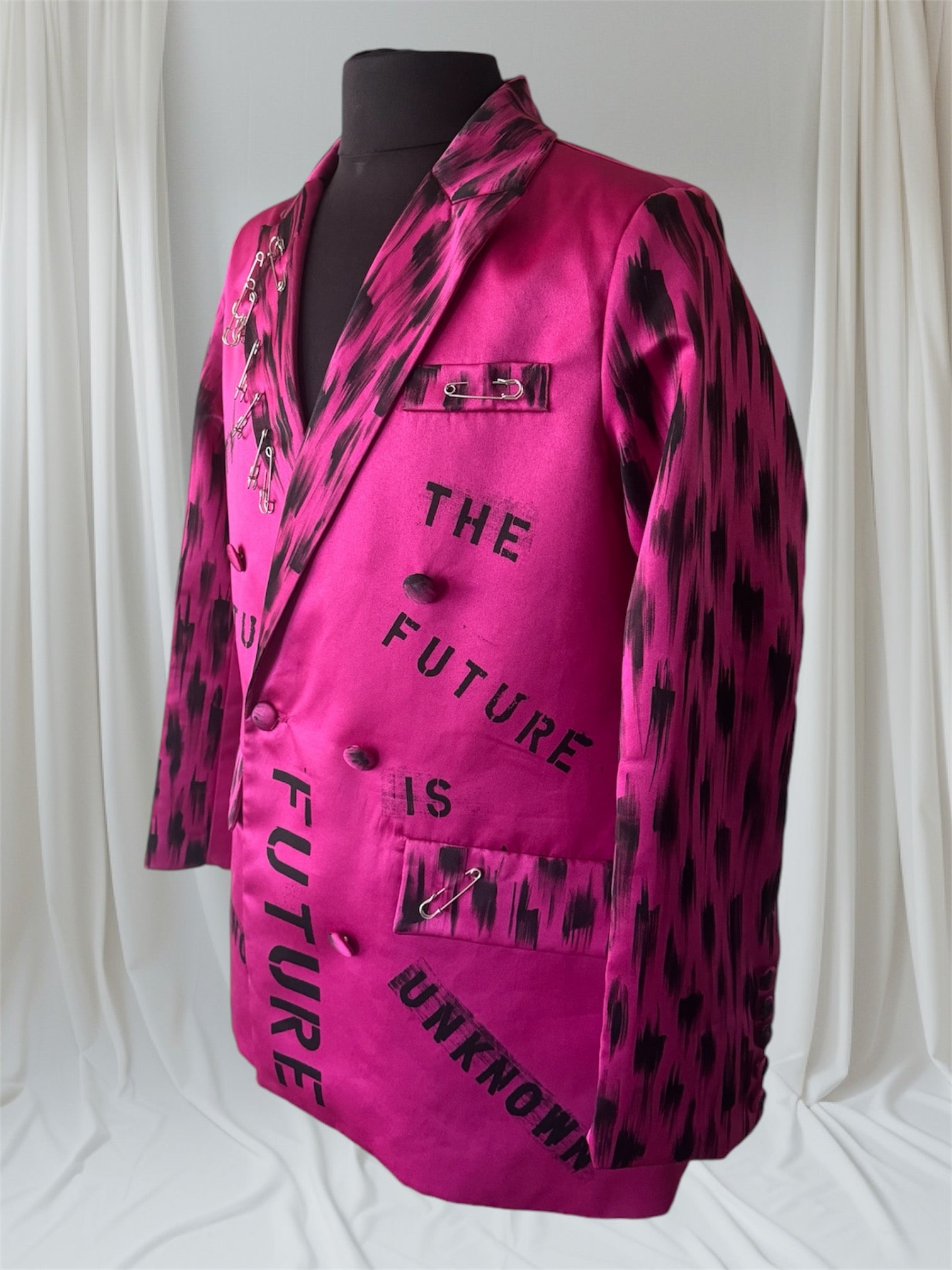 This gorgeous punk-inspired one-of-a-kind mid-weight hot pink suit coat is a show-stopper. Upcycled, hand-painted, and embellished with a rhinestone safety pin. Size X-Large.