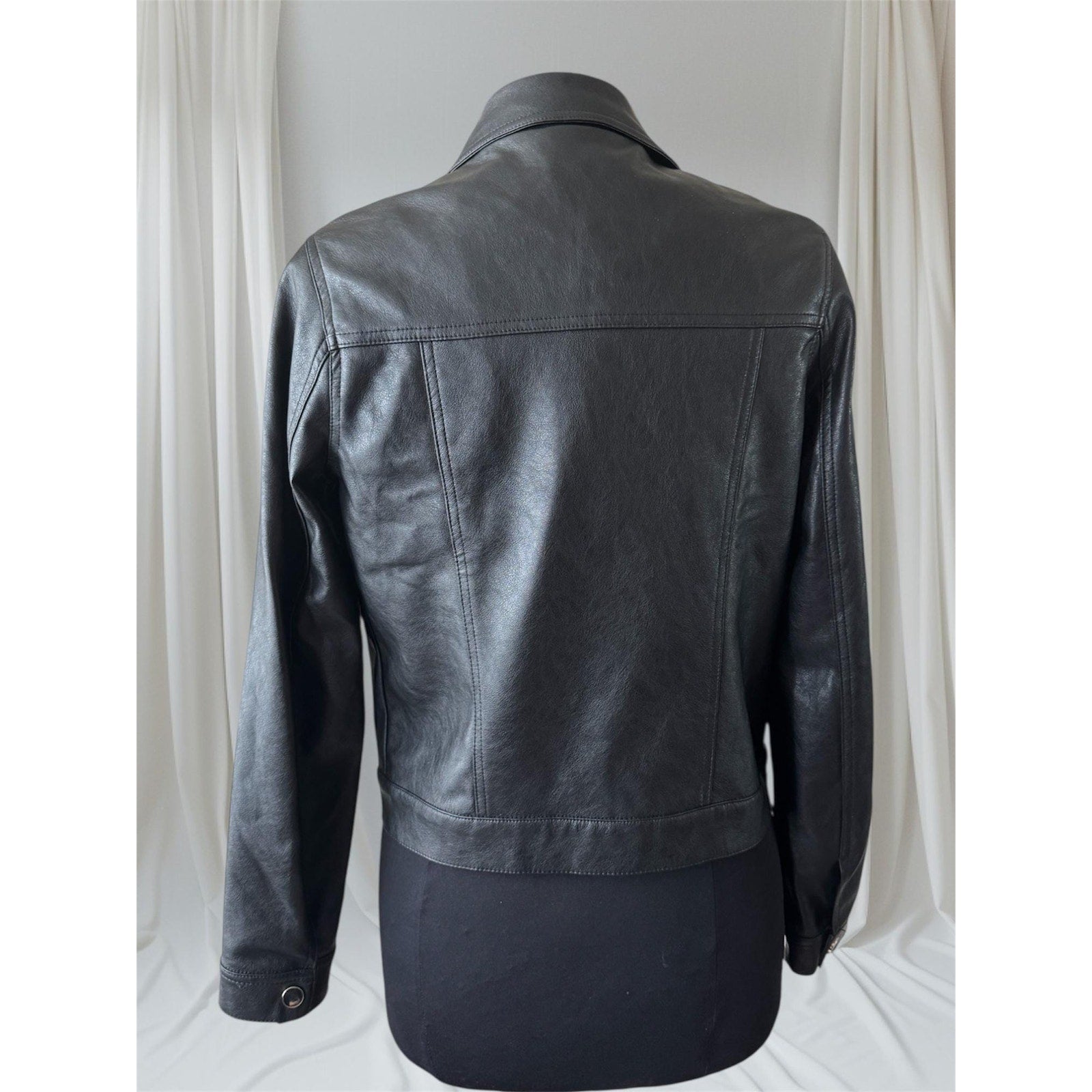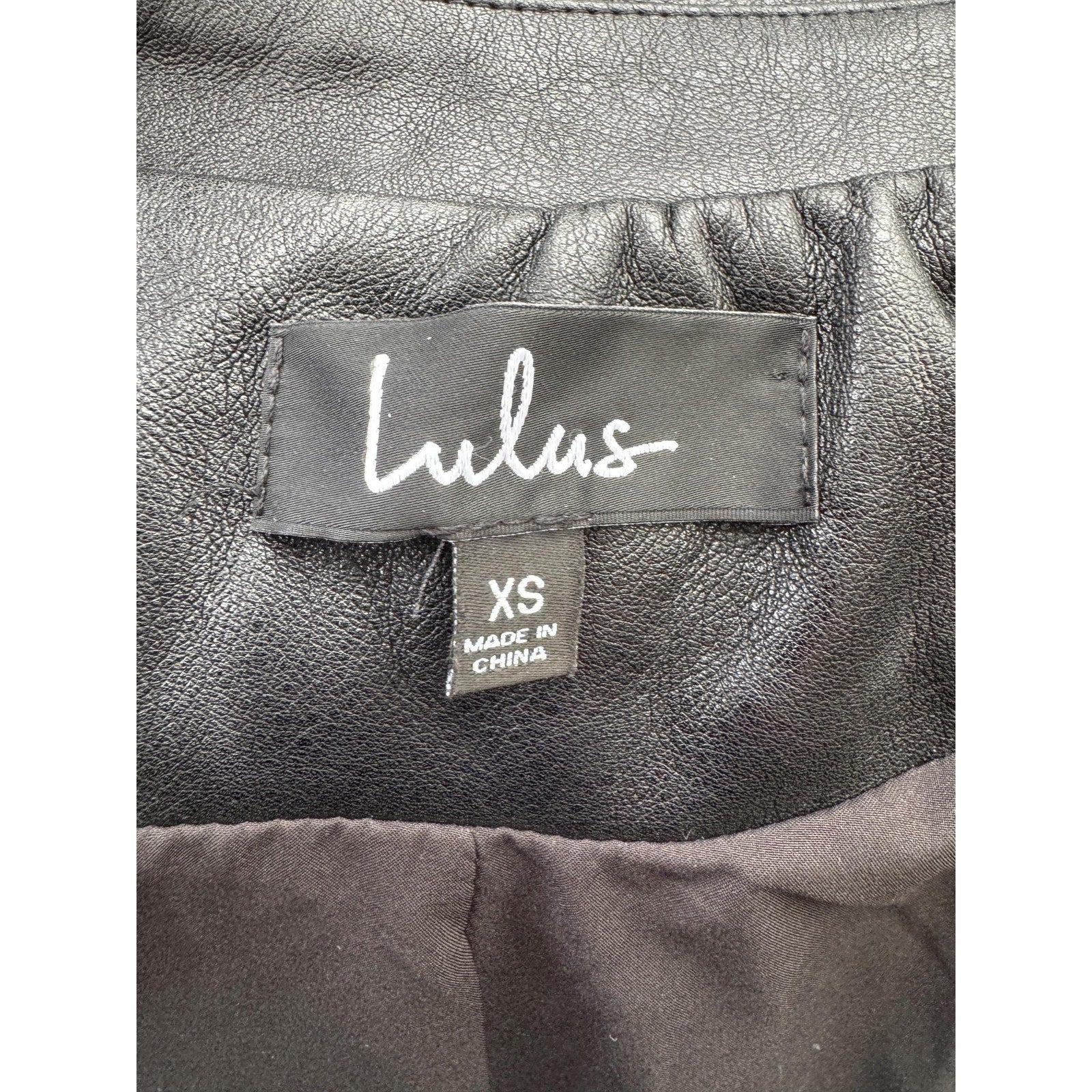 Black Faux Leather Women's TruckerJacket, Size XS, fits like a Small. Brand: Lulu's. Lightweight Faux Leather. New condition. Not sure what year this was manufactured. This is a classically tailored great staple rock n roll fashion piece for any wardrobe. Marked XS, Fits like S.