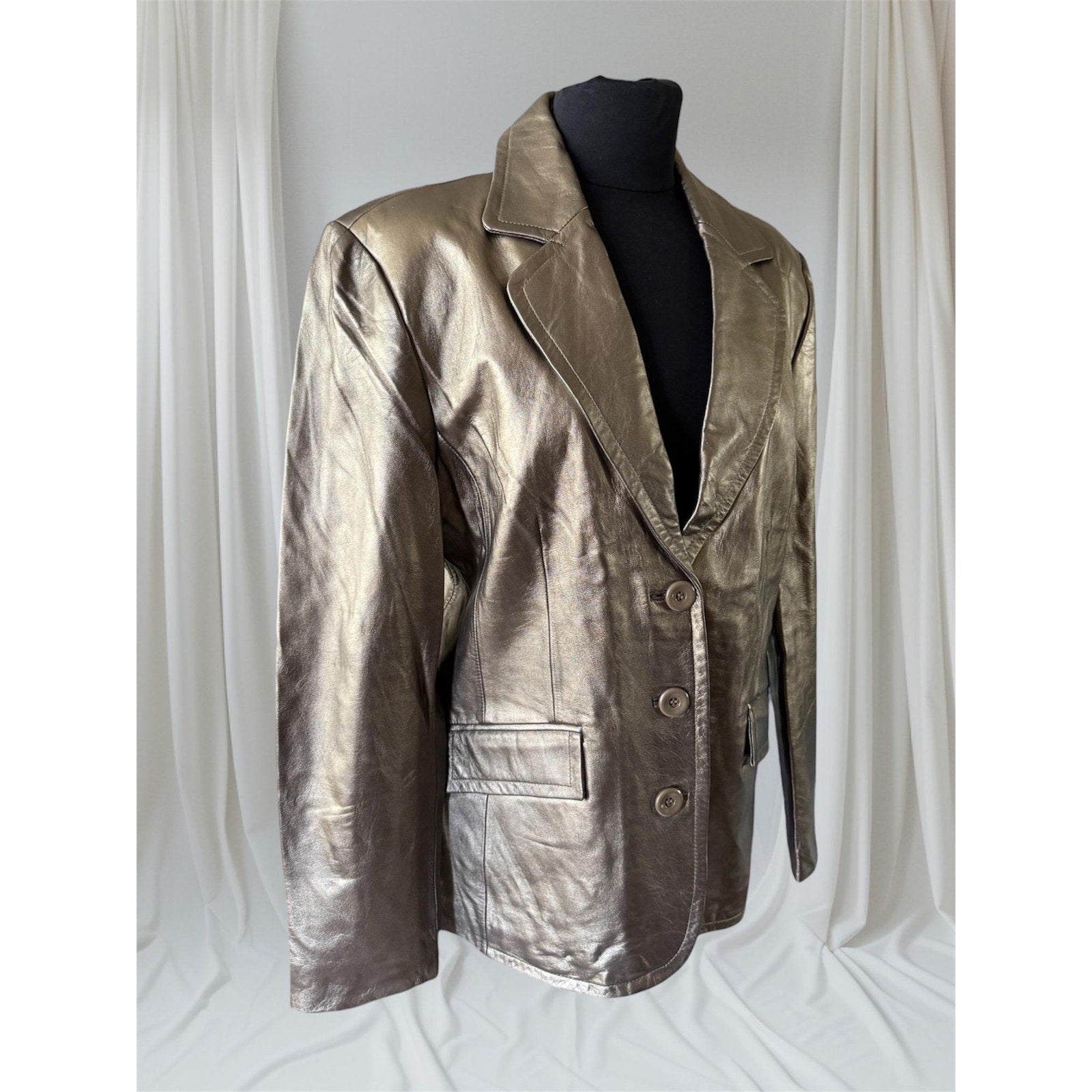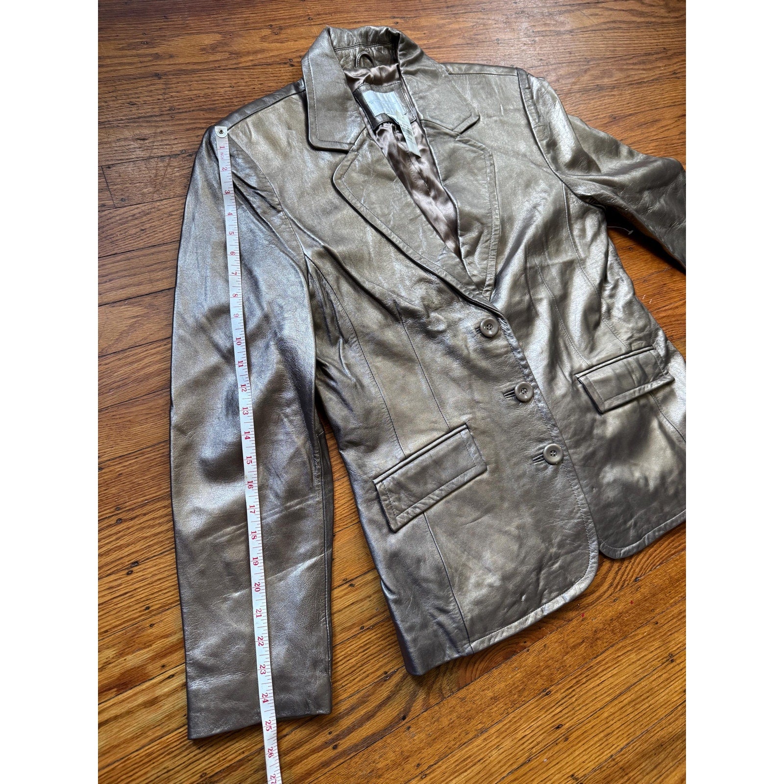 Gold Metallic Genuine Leather Women's Jacket, Size Large. Brand: Worthington. Very Soft & Lightweight Lambskin Leather. New with tag, originally priced at 299 in store. Not sure what year this was manufactured. This is a classically tailored great staple rock n roll statement fashion piece for any wardrobe.